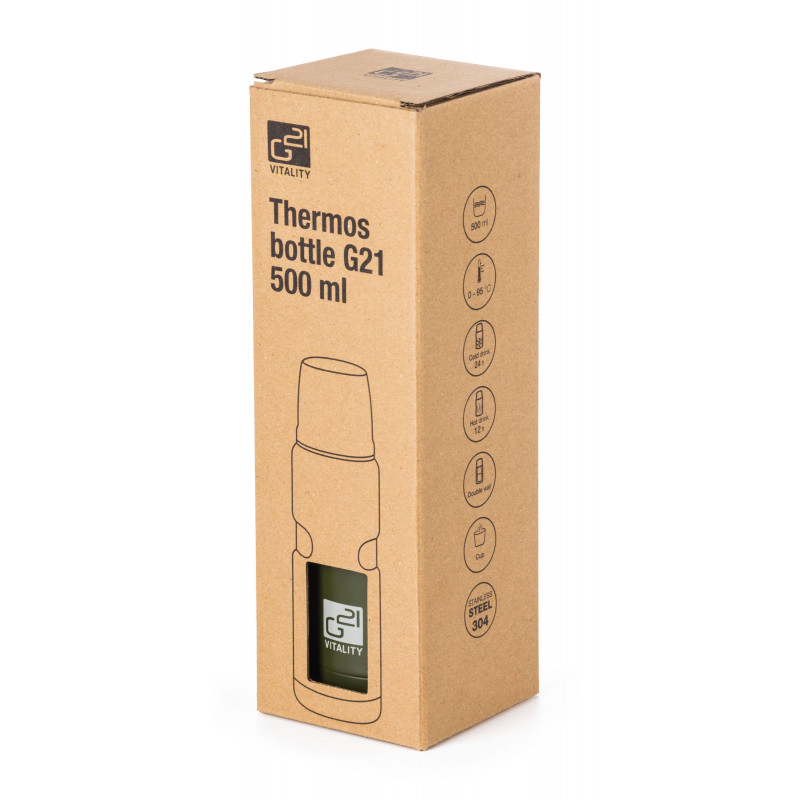 Největší předností termosky G21 je kvalitní termoizolace. Termoláhev z nerezové oceli má dvojité stěny a dokonale těsnící víčko s vnějším krytem. Nápoje tak udrží v požadované teplotě opravdu dlouho – horké až 12 hodin, studené až 24 hodin.